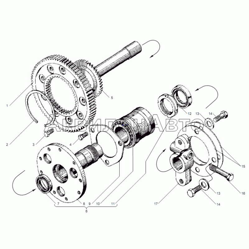 | 6 | 7511.1029120-10 | Ось ведомой шестерни с подшипником и маховиком в сборе |