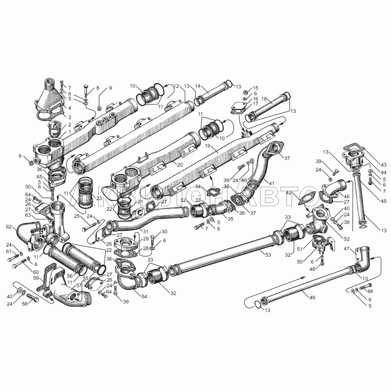Трубы и термостаты системы охлаждения двигателей ЯМЗ-8502.10, ЯМЗ-8502.10-08, ЯМЗ-8503.10