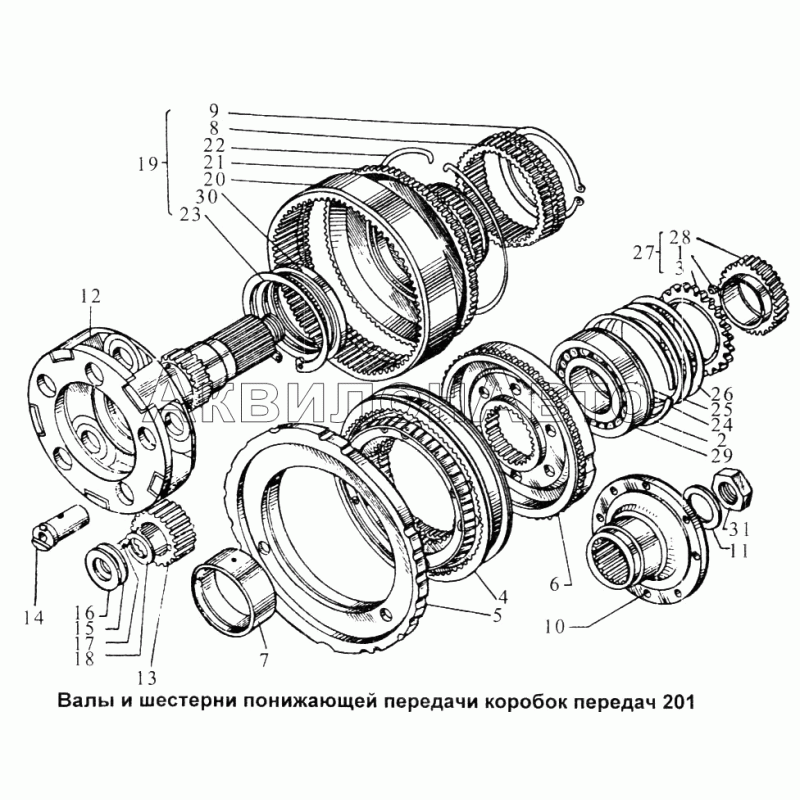 Валы и шестерни понижающей передачи коробок передач 201